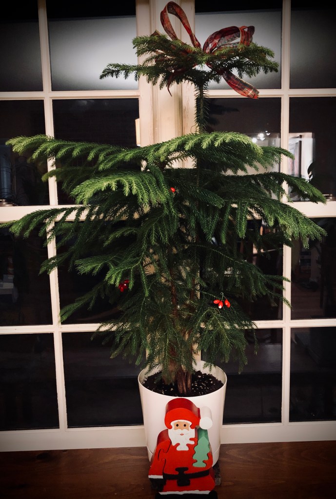 Gibbs, the Norfolk pine, is feeling quite dapper with his jaunty holiday bow